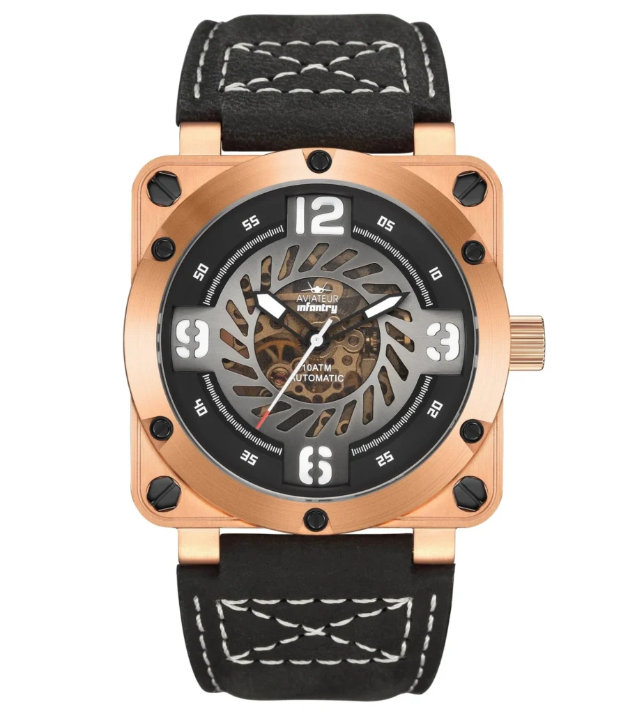 It has a skeleton design with an automatic Miyota 8N24 movement. It’s perfect for outdoor adventure with a PVD-coated stainless steel case, sapphire crystal, exhibition back, and 100 meter water resistance.